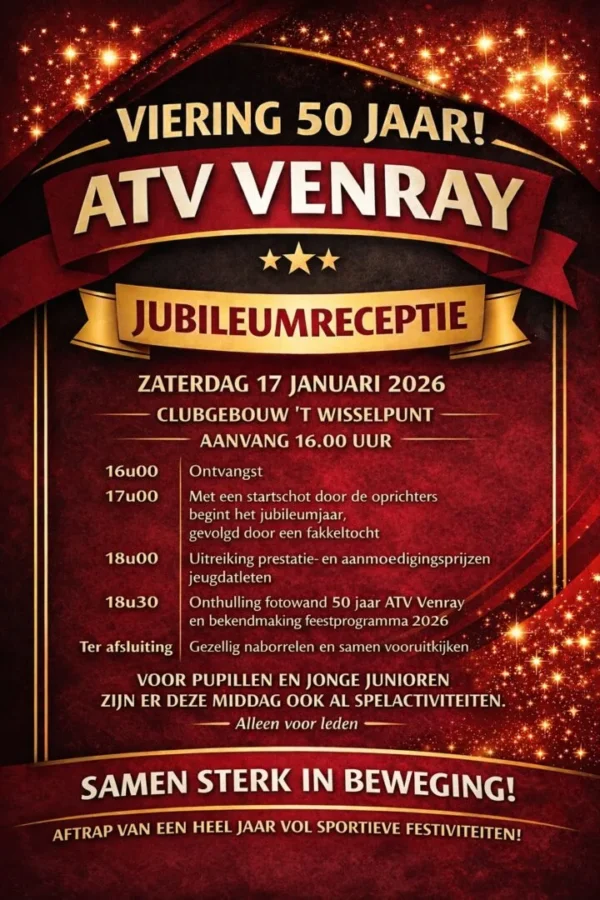 Vlakwatercross 2026 Dit jaar viert ATV Venray 50 jaar Vlakwatercross! Vier dit met ons mee en schrijf je in! Dit jaar voor het eerst ook voor wandelaars. Op zondag 25 januari bent u van harte welkom aan de Kempweg in Venray. Nieuw: wandeltocht We vieren 50 jaar Vlakwatercross met eenMeer lezen >>ATV-Event