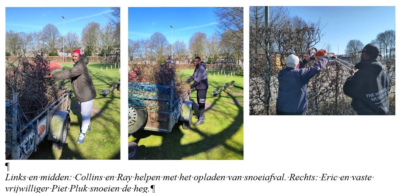 Inmiddels hebben Ray, Eric, Collins en Leo al een paar keer de onderhoudsploeg versterkt met diverse werkzaamheden: groenonderhoud, zoals een heg snoeien, en de kogelsectoren onkruidvrij maken, maar ook hulp bij het verder opbouwen van de nieuwe hoogspringmat, en toen het een keer keihard regende hebben ze met z’n vieren heel het clubhuis, inclusief de kleedkamers en het krachthonk een goede schoonmaakbeurt gegeven.