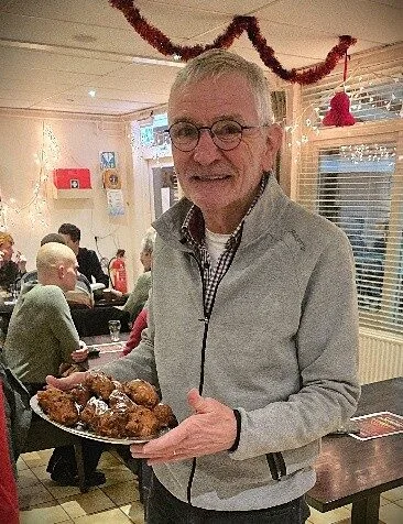 kracht achter de oliebollenachtige afsluiting. Hij heeft die in zijn eentje de hele middag staan bakken en verdient daarmee dan ook terecht eervolle vermelding…. (net als voor het al die jaren publiceren van de wekelijkse nieuwsbrief!)